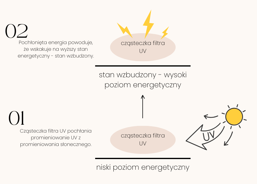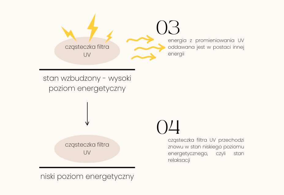Po pochłonięciu promieniowania UV elektrony cząsteczki filtra przeciwsłonecznego posiadają więcej energii i przechodzą w stan wzbudzony (ang. exited). Cząsteczki nie lubią posiadać dużej ilości energii, ponieważ są wtedy niestabilne. Chcą się jej pozbyć. Aby do tego doprowadzić elektrony w cząsteczce filtra przeciwsłonecznego muszą wyemitować tą samą ilość energii, ale w innej formie. Po emisji cząsteczka wraca do poprzedniego stanu energetycznego, czyli stanu relaksacji (ang. relaxation), jest gotowa do wchłonięcie kolejnej porcji promieniowania UV i powtórzenia procesu.