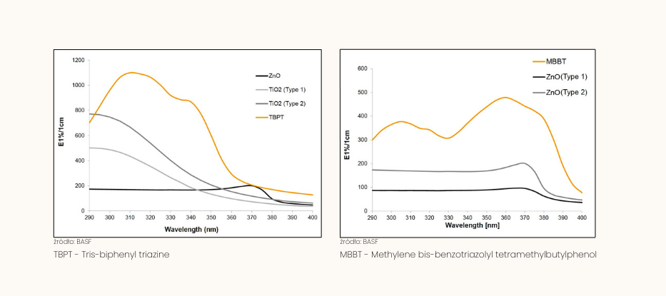Filtry chemiczne, czyli te organiczne są 2-3 razy skuteczniejsze od filtrów mineralnych. Na przedstawionych widmach wykonanych przed BASF możemy odczytać, że filtry chemiczne pochłaniają zdecydowanie więcej promieniowania UV niż tlenek cynku czy dwutlenek tytanu.