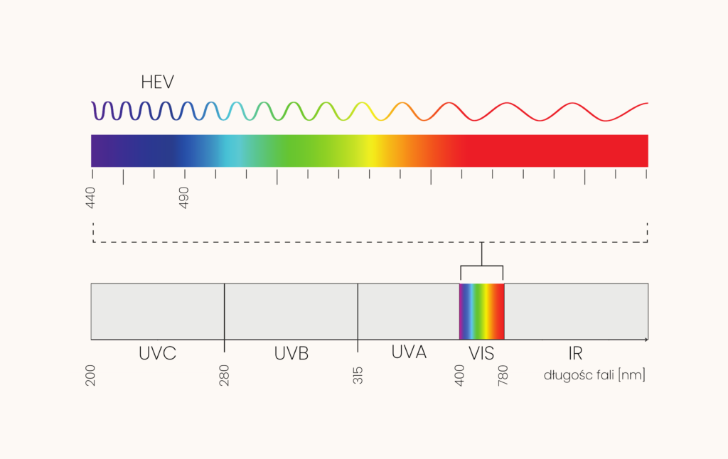 Światło niebieskie (HEV lub HEVL) to część zakresu światła widzialnego. Pasmo światła widzialnego jest na grafikach zazwyczaj podzielone kolorystycznie. Te barwy nie zostały dobrane losowo, każda z nich odpowiada poszczególnym zakresom światła widzialnego. Zaczyna się od światła fioletowego, przez niebieskie, po zielone, żółte, pomarańczowe i czerwone, które przechodzi następnie w promieniowanie podczerwone. Blue Light to pasmo mieszczące się w zakresie 440-490 nm, a więc graniczy z promieniowaniem UVA i ma zbliżoną do niego energię