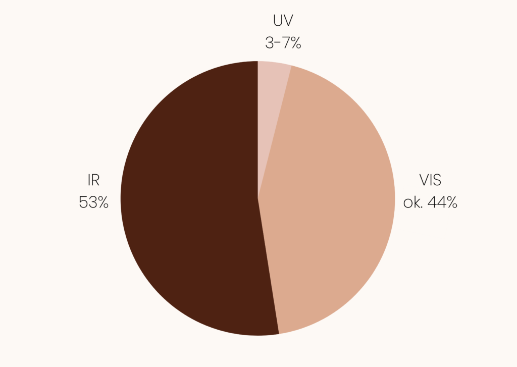 Tak naprawdę niewielką, ponieważ promieniowanie ultrafioletowe to 3-7% całego spektrum promieniowania słonecznego. Pozostała część to światło widzialne (ok. 44%) oraz promieniowanie podczerwone (ok. 53%). Nie chciałabym jednak, aby ta niewielka wartość została źle przez Was zinterpretowana, ponieważ to właśnie te 3-7% jest odpowiedzialne za fotostarzenie, a w najgorszym przypadku za zmiany nowotworowe.