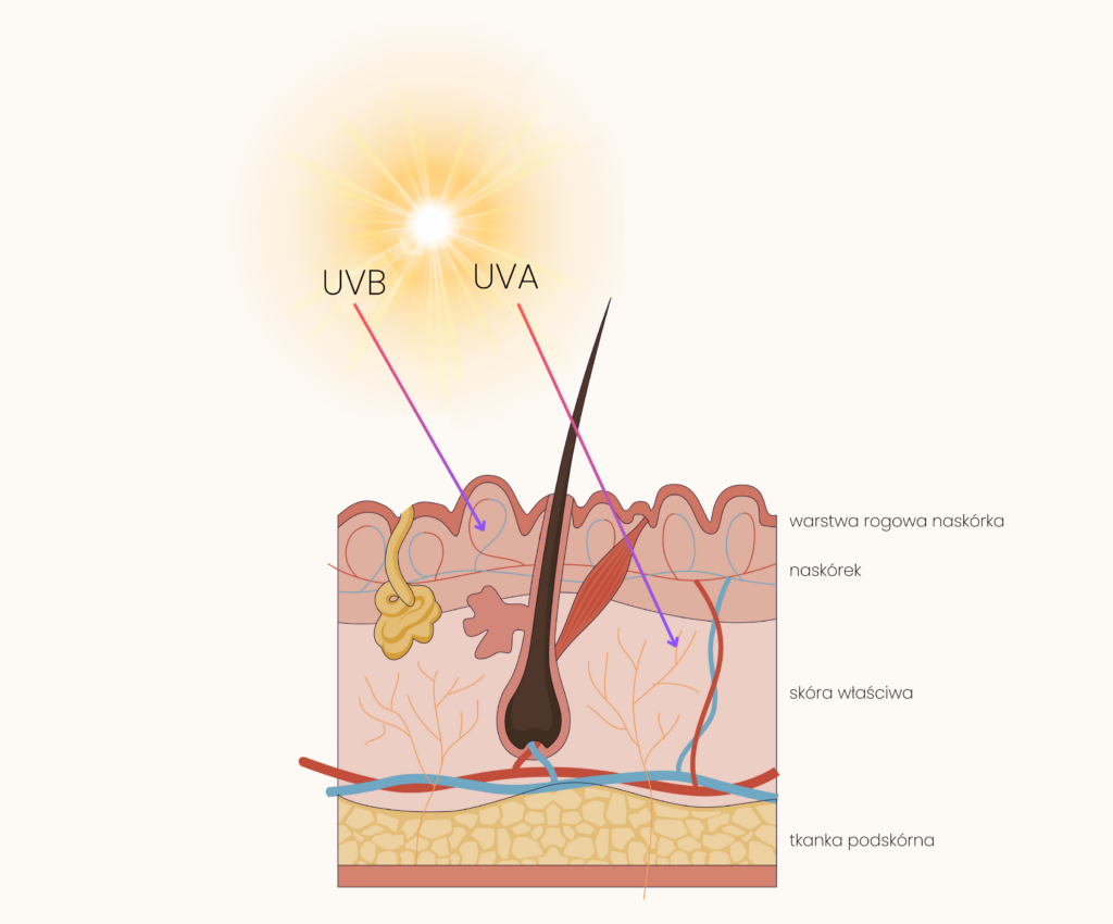 Promieniowanie UVA w ponad 50% przenika do warstwy siateczkowatej i brodawkowatej skóry. Warstwa brodawkowata łączy się z naskórkiem i odpowiada za jego odżywianie oraz odprowadzanie ubocznych produktów przemiany materii w komórkach naskórka. Siateczkowata z kolei chroni głębsze struktury skóry i styka się z tkanką podskórną.